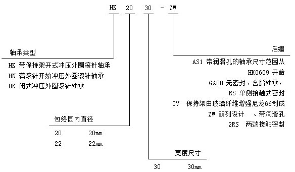 冲压外圈滚针轴承是由一个冲压薄壁外圈与一个滚针和保持架组成的成套轴承单元。具有特别节省空间的结构。设定用淬硬并磨削的轴作为滚道,若轴未经淬硬则应与IR或LR系列内圈结合使用。大多数都是单列设计,双列冲压滚针轴承以具有润滑油孔作为标准特征。冲压外圈滚针轴承容易压入轴承座孔,不需要进一步的轴向定位,可与AXW系列推力滚针轴承结合使用。