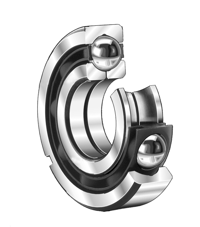 四点接触球轴承为双半内圈,这样可以装入尽量多的钢球。带钢球的外圈组件和半个内圈可以独立安装,轴承调心能力很小。