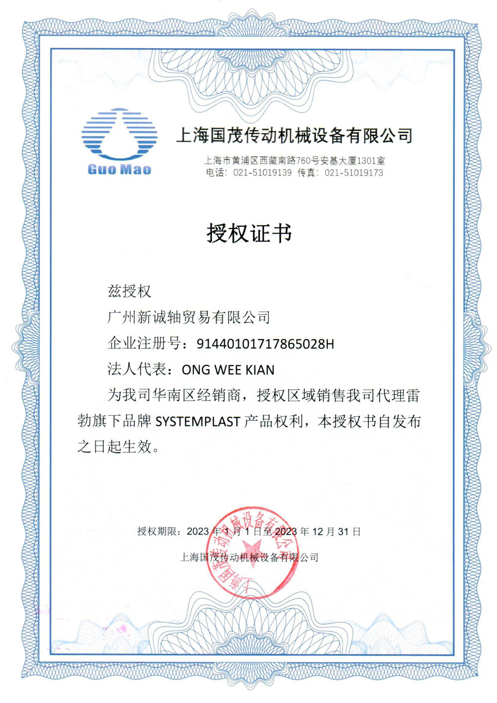 2021年雷吉那授权证书-1