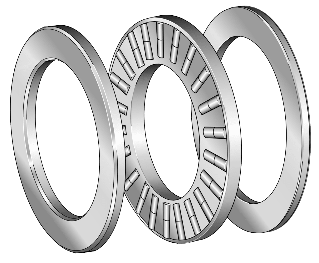 推力滚针及保持架组件是由带集成滚针的塑料或金属的轴向保持架组成,并且轴向截面高度非常小。它们可以支撑一个方向上的很大的轴向力。径向负荷必须采取另外的方法来承担。轴向滚针及保持架组件要求硬化并打磨轴向跑合面以作滚道用。